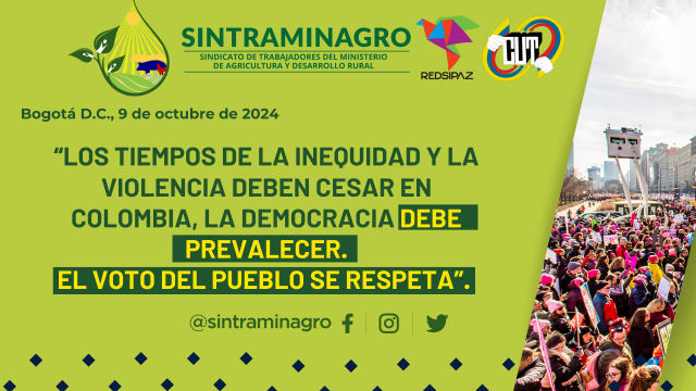 El Sindicato de Trabajadores del Ministerio de Agricultura y Desarrollo Rural – SINTRAMINAGRO, expresa su total acuerdo con las palabras del señor Presidente en su alocución del día de hoy, 08 de octubre de 2024, y manifestamos nuestro apoyo incondicional.